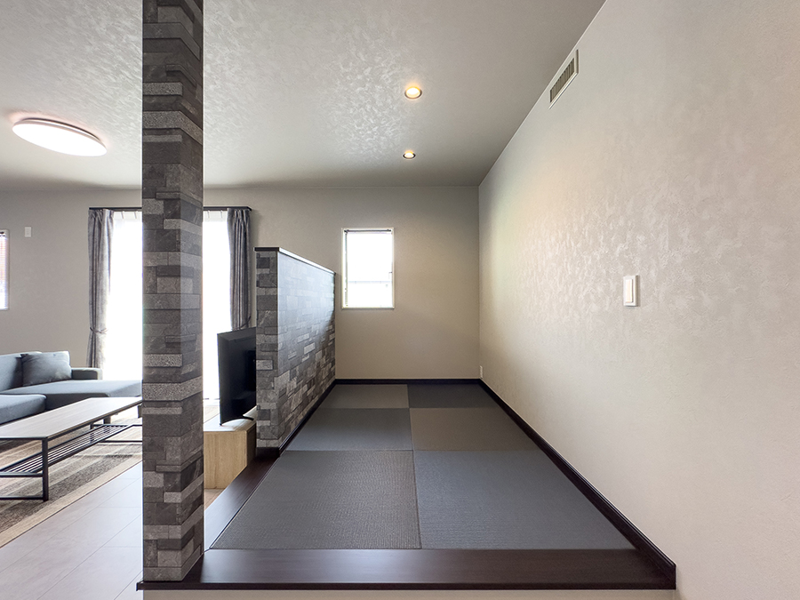 26帖という大空間に、石目調のアクセントクロスが効いた重厚感あふれるモダンなインテリア。