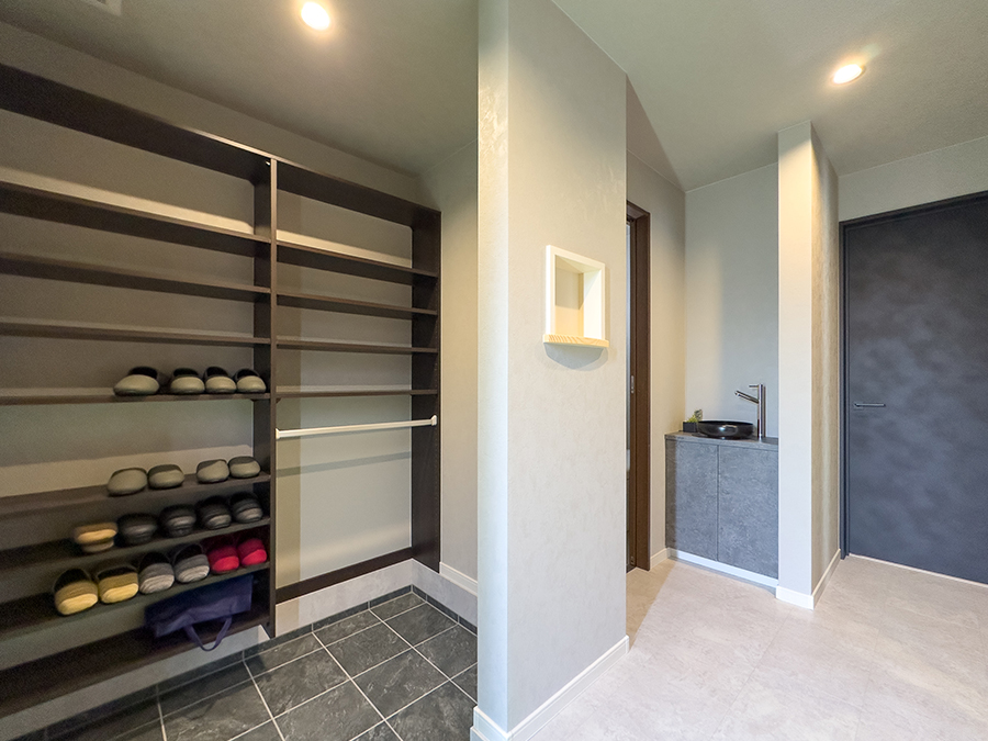 玄関から大容量のシューズインクロゼットを通り、そのままファミリークローゼット、ランドリーへと繋がる、理想的な「帰宅動線」を確保。
