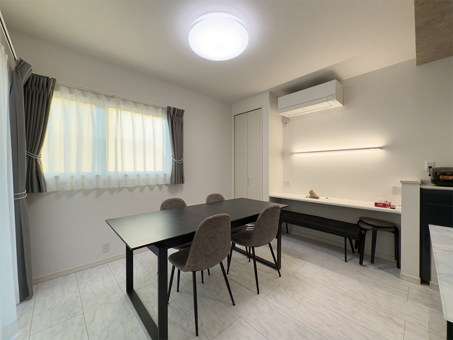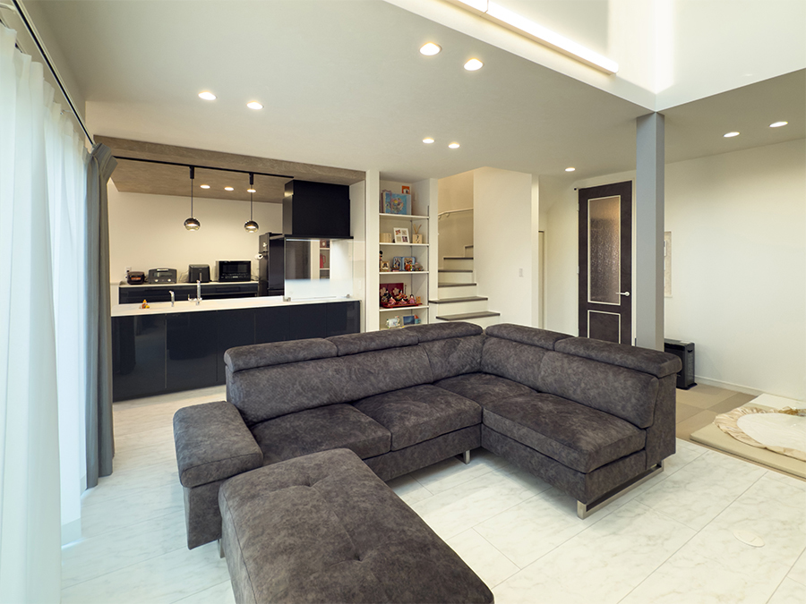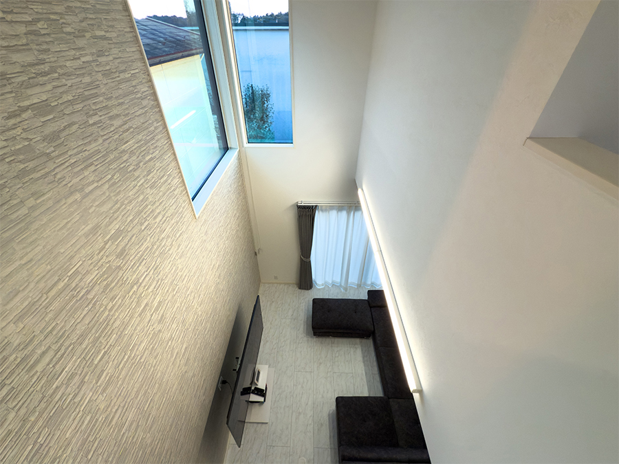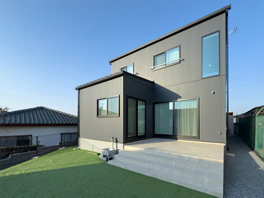 ホーム  —  施工事例  —  吹抜けとタイルデッキのある1.5階建ての家
